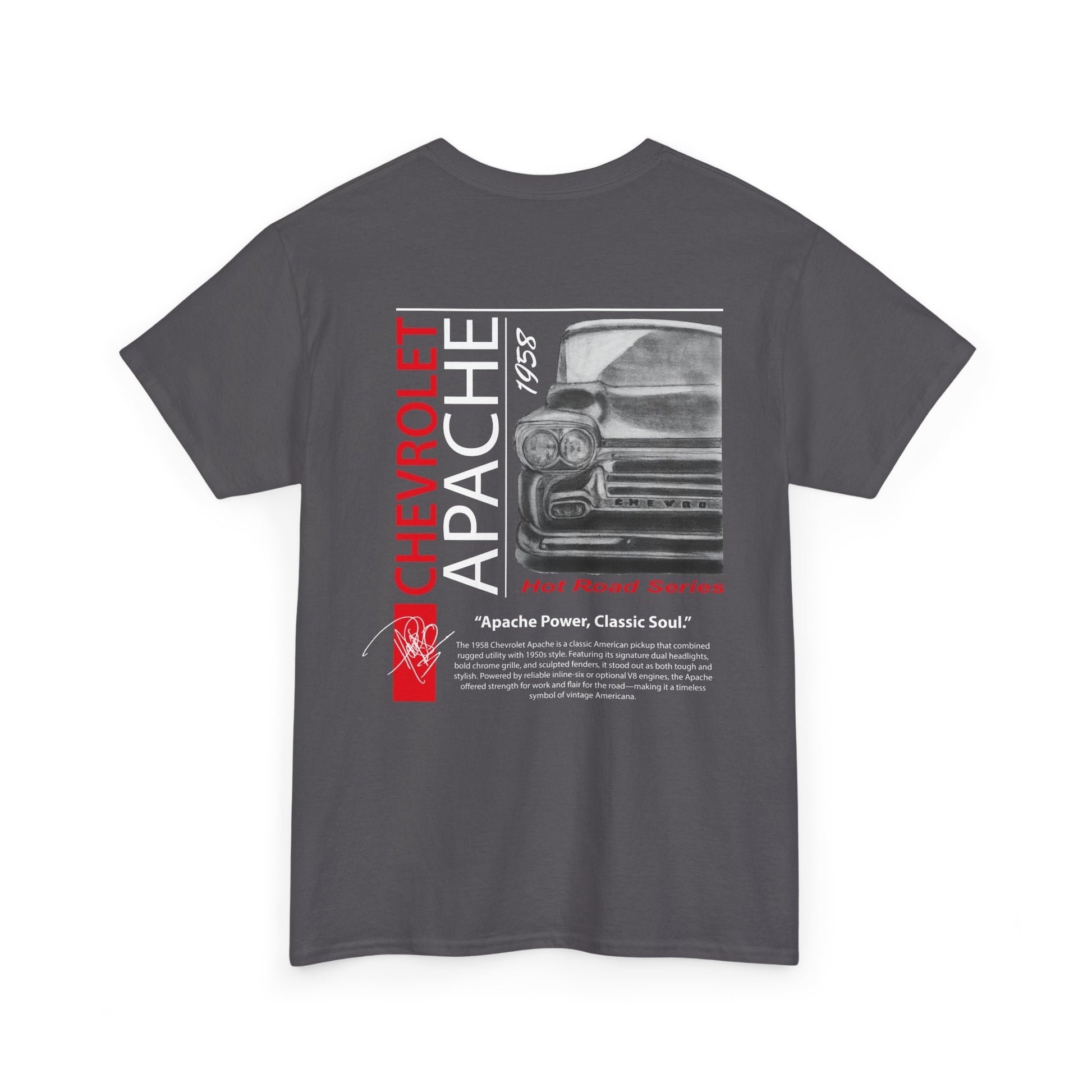 A timeless, slightly oversized tee that celebrates old-school muscle and quiet road nights. The soft, mid-weight cotton feels sturdy yet broken-in, the ribbed crew holds its shape, and the clean tubular construction keeps lines simple so the vintage-inspired back graphic stands out. The design evokes headlights in rain, chrome reflections and the low rumble of a classic Chevrolet Apache — a shirt made for late drives, garage conversations, and leaning against a hood while the sky cools. Wear it with worn denim, a flannel over the shoulders, or under a light jacket when the evening air sharpens; the understated front badge and bold rear print balance subtlety and attitude.