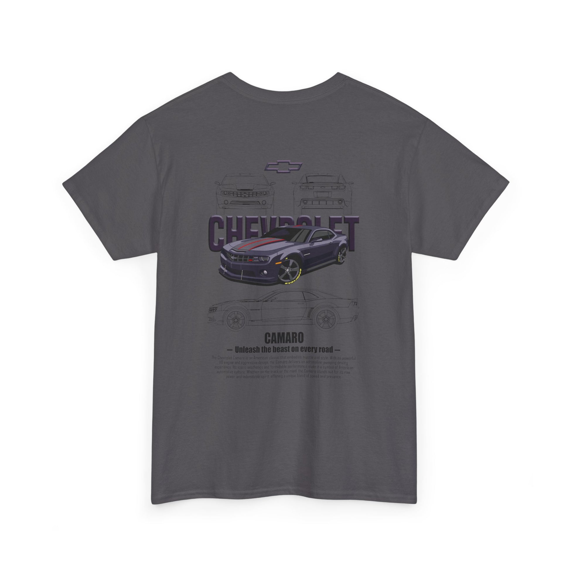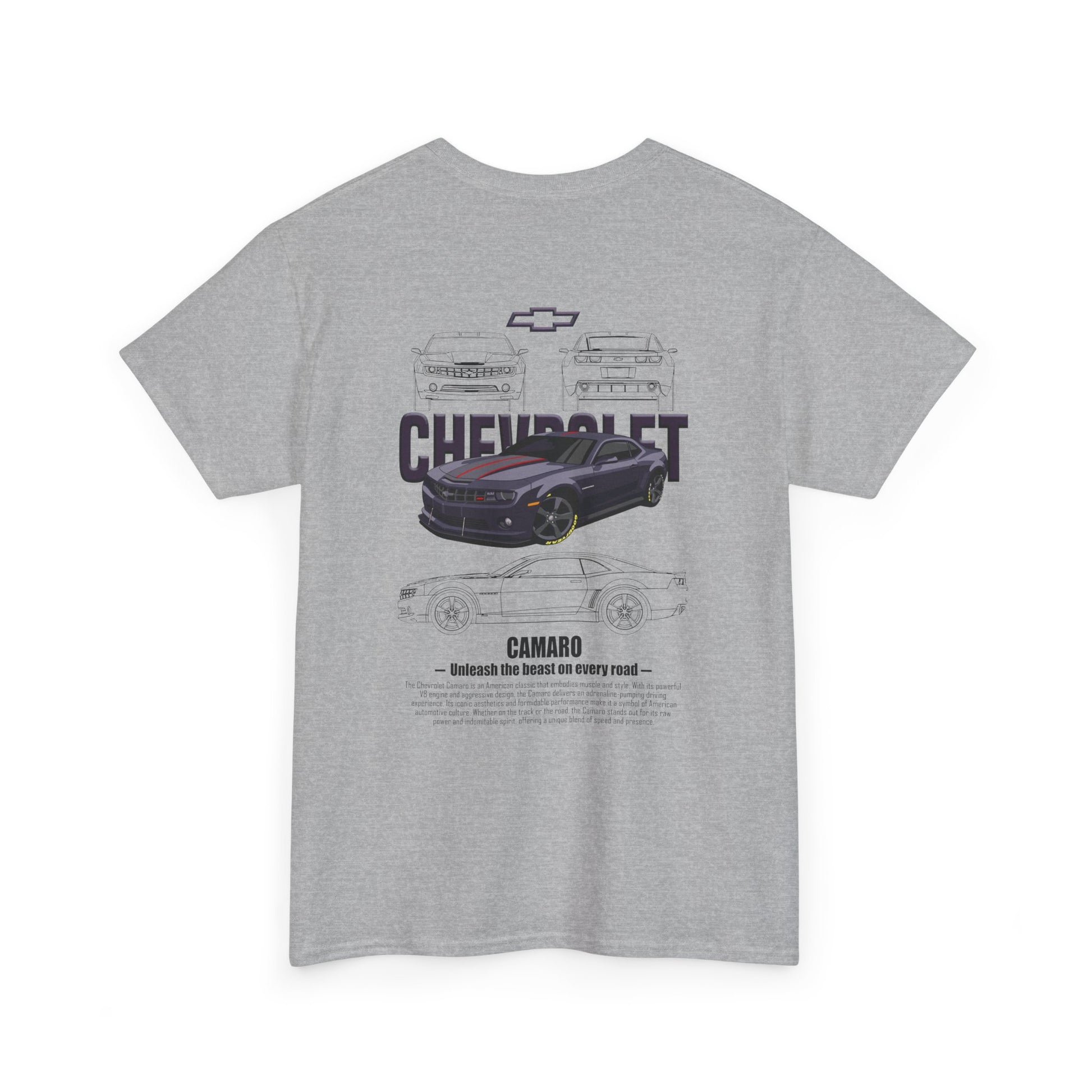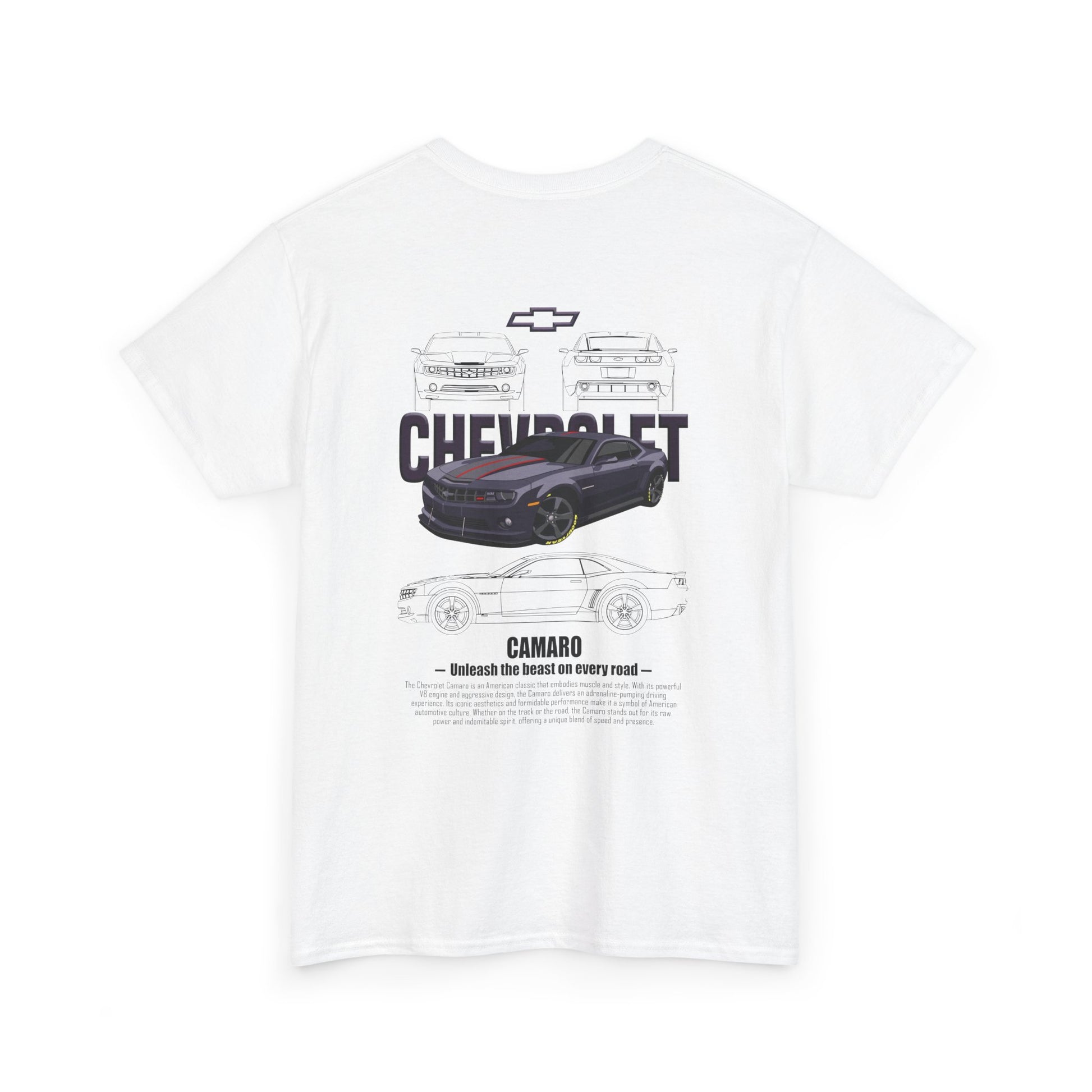 A clean, classic tee that celebrates automotive passion with subtle attitude. On a soft, sturdy cotton canvas a vintage-inspired Camaro layout rests across the back — technical line drawings, a bold Chevrolet wordmark and a realistically rendered muscle car create a layered, workshop-meets-showroom look. A small, embroidered-style emblem sits over the heart for balance. Wear it while wrenching in the garage, meeting fellow enthusiasts at cruise night, or slipping into city streets for a low-key nod to classic muscle cars. The shirt feels lived-in but durable; the breathable cotton and relaxed cut let you move freely while keeping the focus on the design.